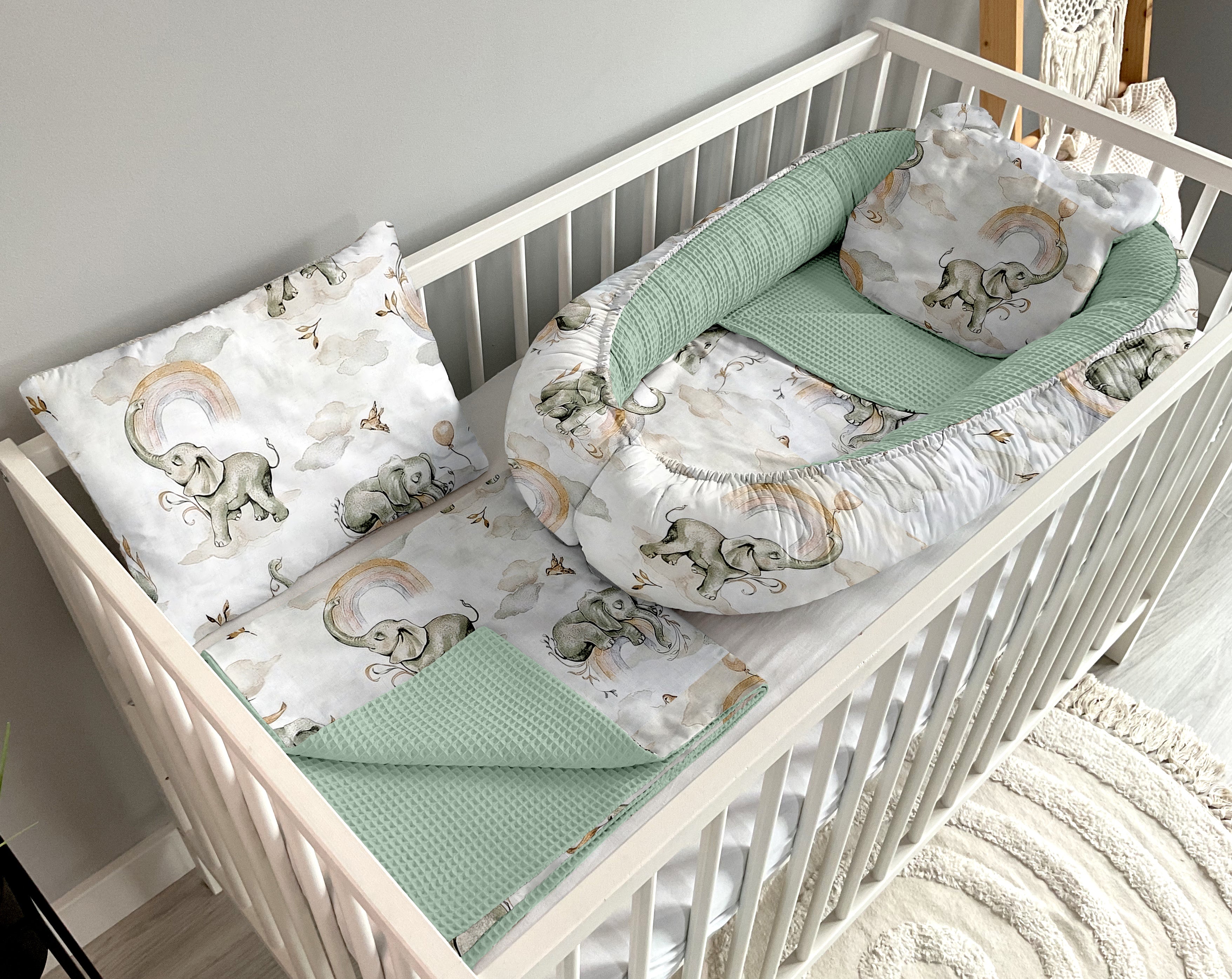 Babynestchen 5-teiliges Set | Beige Elefanten und schmutziges Mint