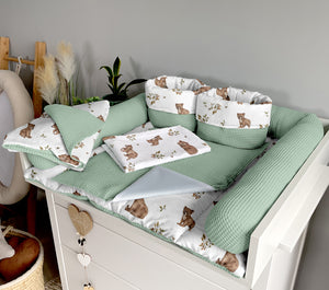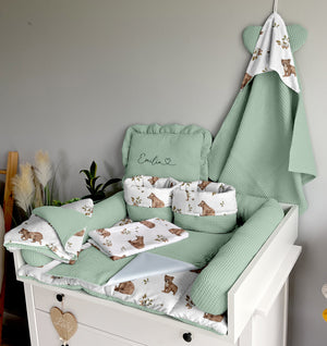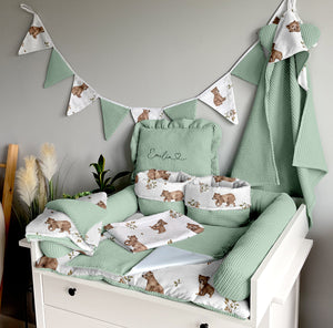 Set 8: Changing mat + two waterproof pads + protective roller + two baskets + blanket 100x75cm + towel 75x75cm + pillow with name + garland