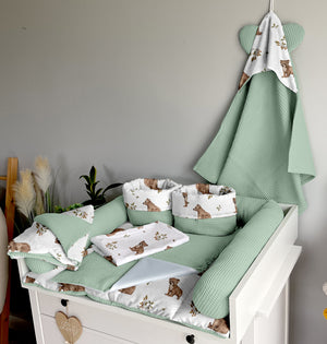 Sizes: The mat is about 3-4 cm thick and filled with certified anti-allergic filling. The length of the protective roller is 200cm (78 inches), its diameter is about 10cm (3.9 inches). The size of the blanket is 100x75cm (39x29 inches) and it has no filling, it is a summer blanket. The size of the hooded towel is 75x75cm (29x29 inches) and it will also be great as a bathing cover on the beach. The baskets measure 19cm (7.4 inches) in diameter and 19cm (7.4 inches) in height + 5cm (1.9 inches) folded fold. All sizes +/- 2cm. The dimensions of the pillow are approx. 45cm x 32cm (with ruffles). The embroidery is approximately 20 cm wide and always ends with a heart. The length of the garland is 161 cm plus 50 cm on each side for attachment, it has 9 flags as in the photo.