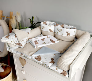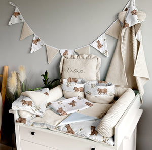 Set 8: Changing mat + two waterproof pads + protective roller + two baskets + blanket 100x75cm + towel 75x75cm + pillow with name + garland