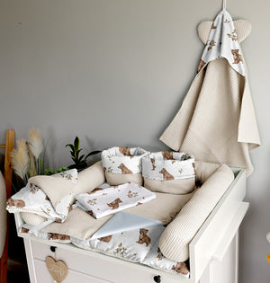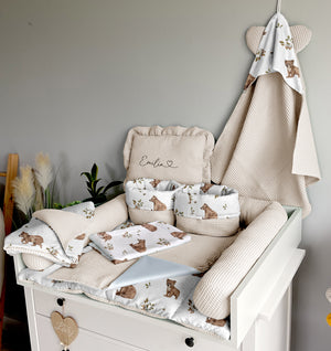 Set 7: Changing mat + two waterproof pads + protective roller + two baskets + blanket 100x75cm + towel 75x75cm + pillow with name