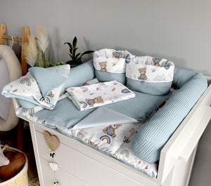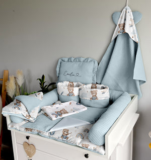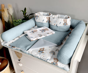 Set 7: Changing mat + two waterproof pads + protective roller + two baskets + blanket 100x75cm + towel 75x75cm + pillow with name