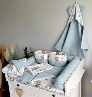Sizes: The mat is about 3-4 cm thick and filled with certified anti-allergic filling. The length of the protective roller is 200cm (78 inches), its diameter is about 10cm (3.9 inches). The size of the blanket is 100x75cm (39x29 inches) and it has no filling, it is a summer blanket. The size of the hooded towel is 75x75cm (29x29 inches) and it will also be great as a bathing cover on the beach. The baskets measure 19cm (7.4 inches) in diameter and 19cm (7.4 inches) in height + 5cm (1.9 inches) folded fold. All sizes +/- 2cm. The dimensions of the pillow are approx. 45cm x 32cm (with ruffles). The embroidery is approximately 20 cm wide and always ends with a heart. The length of the garland is 161 cm plus 50 cm on each side for attachment, it has 9 flags as in the photo.