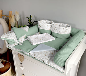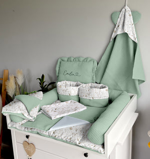 Set 8: Changing mat + two waterproof pads + protective roller + two baskets + blanket 100x75cm + towel 75x75cm + pillow with name + garland