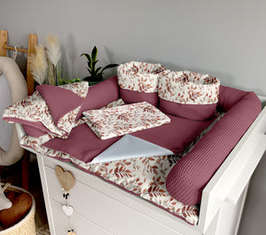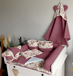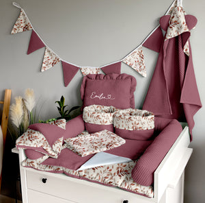 Set 8: Changing mat + two waterproof pads + protective roller + two baskets + blanket 100x75cm + towel 75x75cm + pillow with name + garland