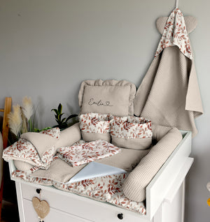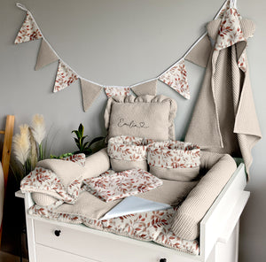 Set 8: Changing mat + two waterproof pads + protective roller + two baskets + blanket 100x75cm + towel 75x75cm + pillow with name + garland
