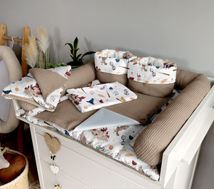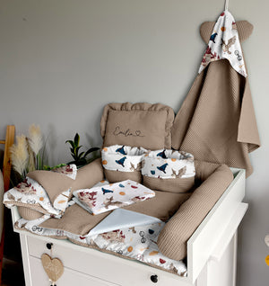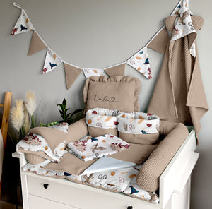 Set 8: Changing mat + two waterproof pads + protective roller + two baskets + blanket 100x75cm + towel 75x75cm + pillow with name + garland