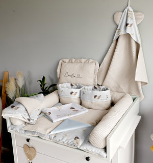 Set 8: Changing mat + two waterproof pads + protective roller + two baskets + blanket 100x75cm + towel 75x75cm + pillow with name + garland