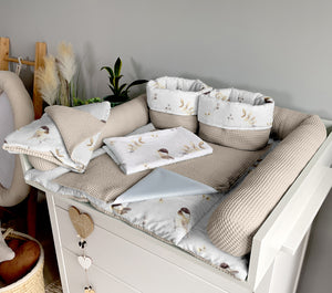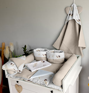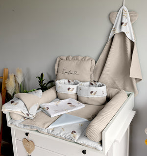 Set 8: Changing mat + two waterproof pads + protective roller + two baskets + blanket 100x75cm + towel 75x75cm + pillow with name + garland