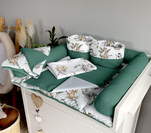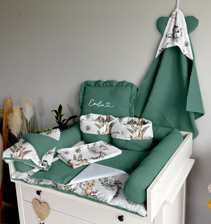 Set 8: Changing mat + two waterproof pads + protective roller + two baskets + blanket 100x75cm + towel 75x75cm + pillow with name + garland