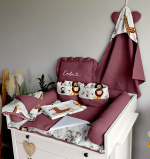 Set 7: Changing mat + two waterproof pads + protective roller + two baskets + blanket 100x75cm + towel 75x75cm + pillow with name