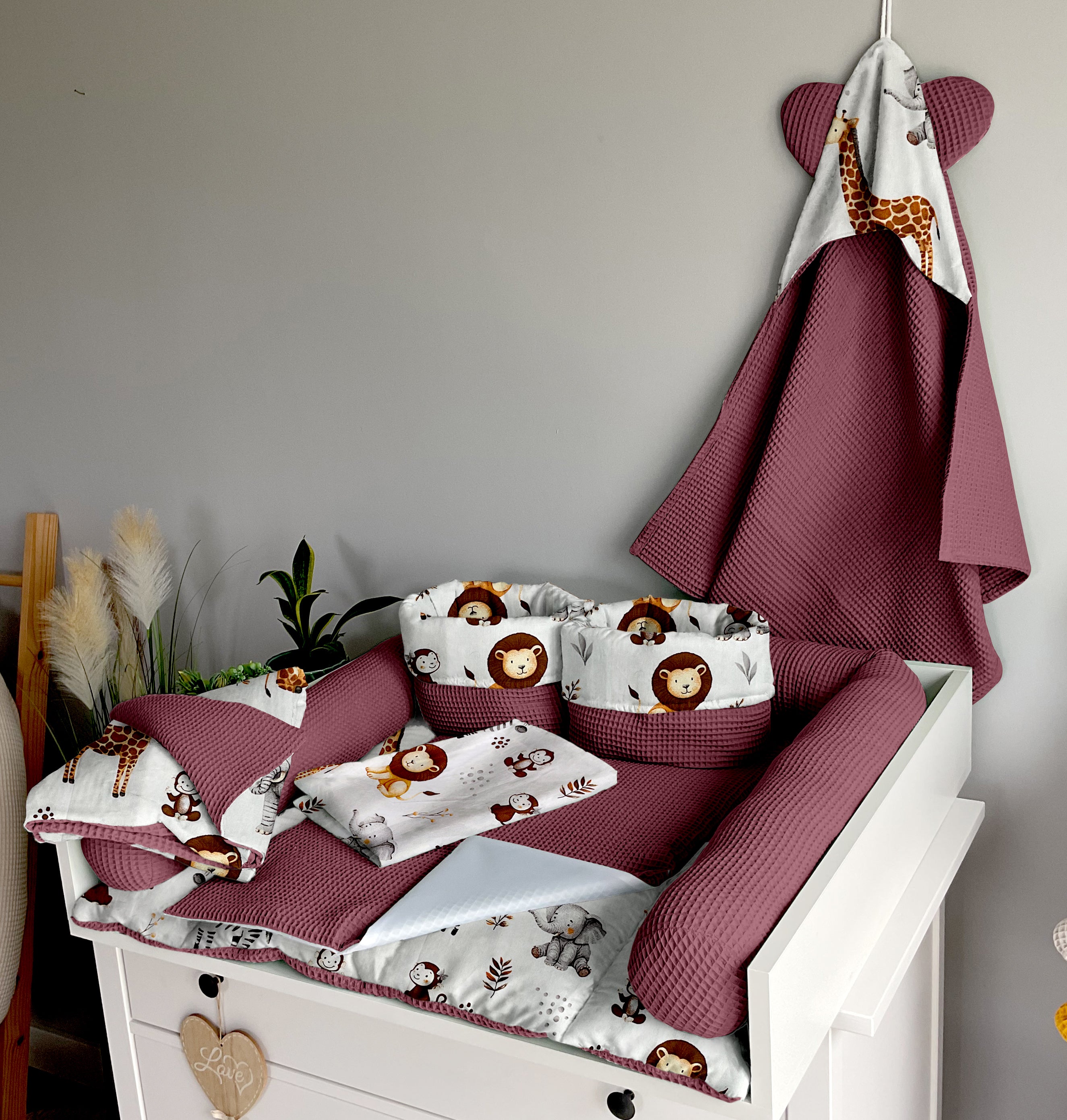 Set 8: Changing mat + two waterproof pads + protective roller + two baskets + blanket 100x75cm + towel 75x75cm + pillow with name + garland