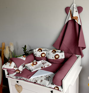 Sizes: The mat is about 3-4 cm thick and filled with certified anti-allergic filling. The length of the protective roller is 200cm (78 inches), its diameter is about 10cm (3.9 inches). The size of the blanket is 100x75cm (39x29 inches) and it has no filling, it is a summer blanket. The size of the hooded towel is 75x75cm (29x29 inches) and it will also be great as a bathing cover on the beach. The baskets measure 19cm (7.4 inches) in diameter and 19cm (7.4 inches) in height + 5cm (1.9 inches) folded fold. All sizes +/- 2cm. The dimensions of the pillow are approx. 45cm x 32cm (with ruffles). The embroidery is approximately 20 cm wide and always ends with a heart. The length of the garland is 161 cm plus 50 cm on each side for attachment, it has 9 flags as in the photo.