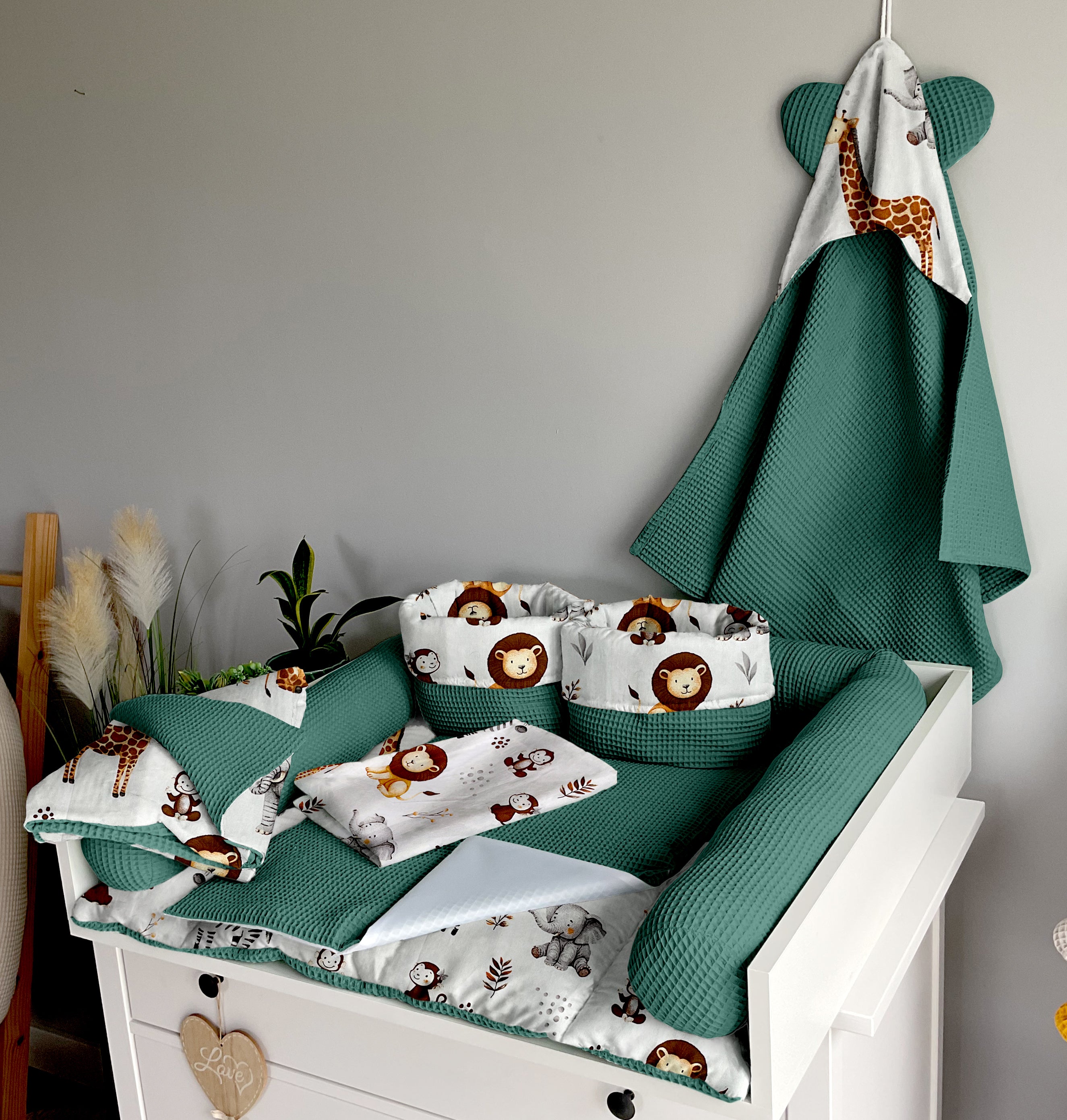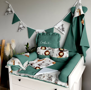 Set 8: Changing mat + two waterproof pads + protective roller + two baskets + blanket 100x75cm + towel 75x75cm + pillow with name + garland