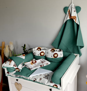 Sizes: The mat is about 3-4 cm thick and filled with certified anti-allergic filling. The length of the protective roller is 200cm (78 inches), its diameter is about 10cm (3.9 inches). The size of the blanket is 100x75cm (39x29 inches) and it has no filling, it is a summer blanket. The size of the hooded towel is 75x75cm (29x29 inches) and it will also be great as a bathing cover on the beach. The baskets measure 19cm (7.4 inches) in diameter and 19cm (7.4 inches) in height + 5cm (1.9 inches) folded fold. All sizes +/- 2cm. The dimensions of the pillow are approx. 45cm x 32cm (with ruffles). The embroidery is approximately 20 cm wide and always ends with a heart. The length of the garland is 161 cm plus 50 cm on each side for attachment, it has 9 flags as in the photo.