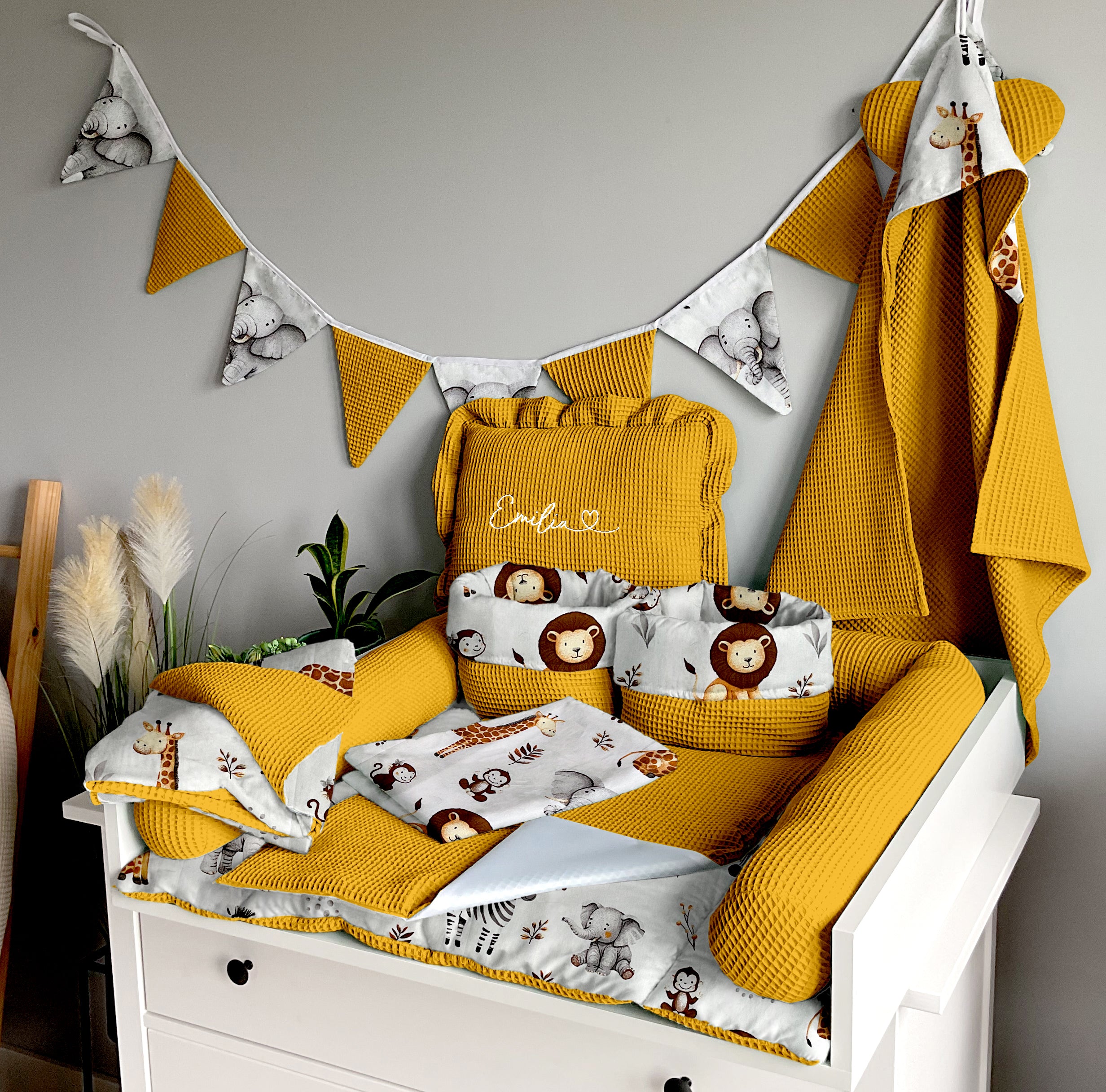Set 8: Changing mat + two waterproof pads + protective roller + two baskets + blanket 100x75cm + towel 75x75cm + pillow with name + garland