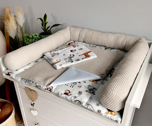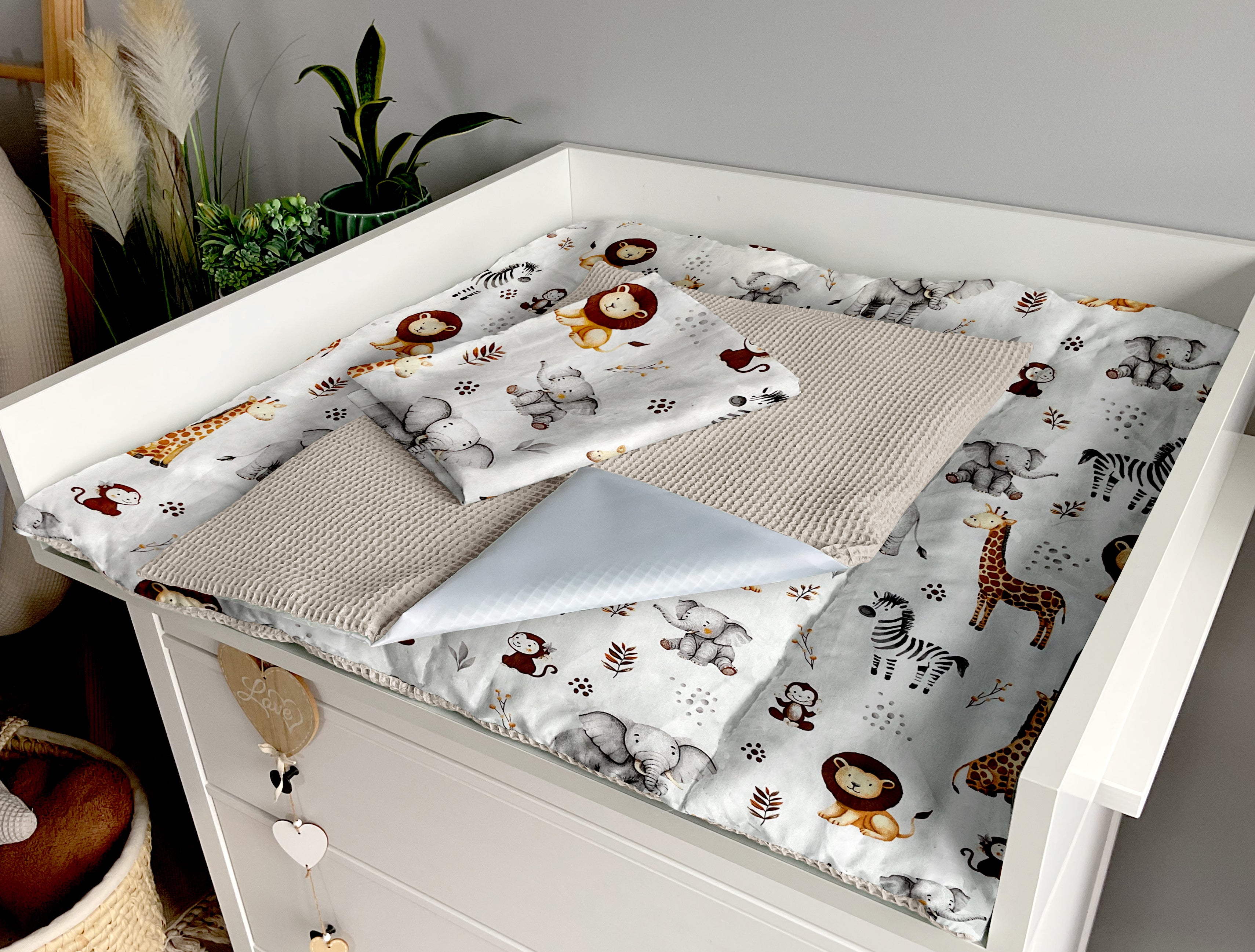 A set for use on a changing table. It will serve from birth, giving you comfort when changing your baby. Choose the size of your changing table. Width (W) Depth (H). If you need a different dimension, please write to us.