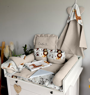 Set 7: Changing mat + two waterproof pads + protective roller + two baskets + blanket 100x75cm + towel 75x75cm + pillow with name