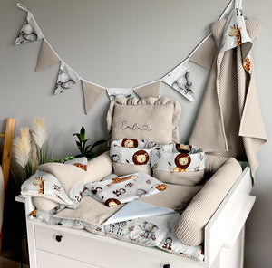 Set 8: Changing mat + two waterproof pads + protective roller + two baskets + blanket 100x75cm + towel 75x75cm + pillow with name + garland