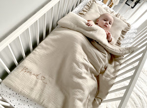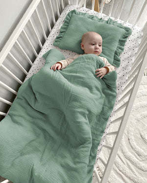 This incredibly soft muslin bedding set, measuring 100x75cm and including a flat 40x50cm pillow, is perfect for a baby from the first days of life. The set features a permanently sewn-in filling and is fully washable, making it incredibly practical! (See washing instructions at the bottom of the description.)