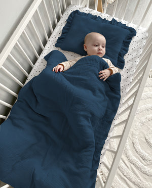 This incredibly soft muslin bedding set, measuring 100x75cm and including a flat 40x50cm pillow, is perfect for a baby from the first days of life. The set features a permanently sewn-in filling and is fully washable, making it incredibly practical! (See washing instructions at the bottom of the description.)